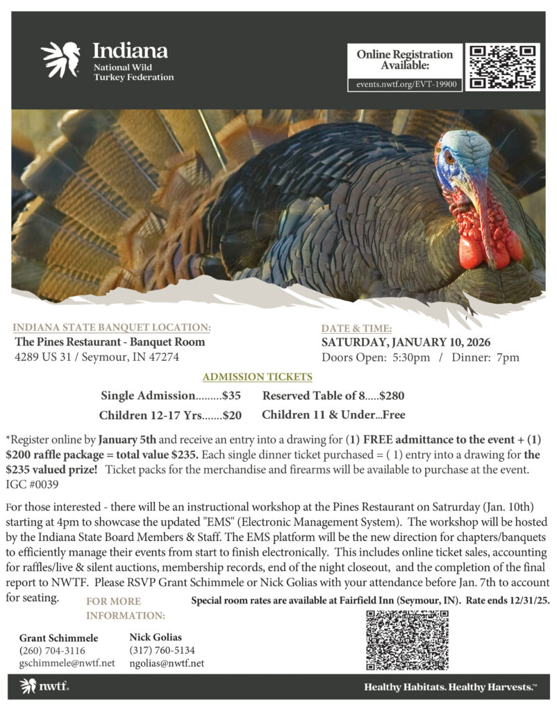 In addition to the local Chapter’s banquets throughout the year, the NWTF has an annual State Banquet every January. The Indiana Banquet moves locations from northern, central and southern Indiana every year to highlight different parts of the state.